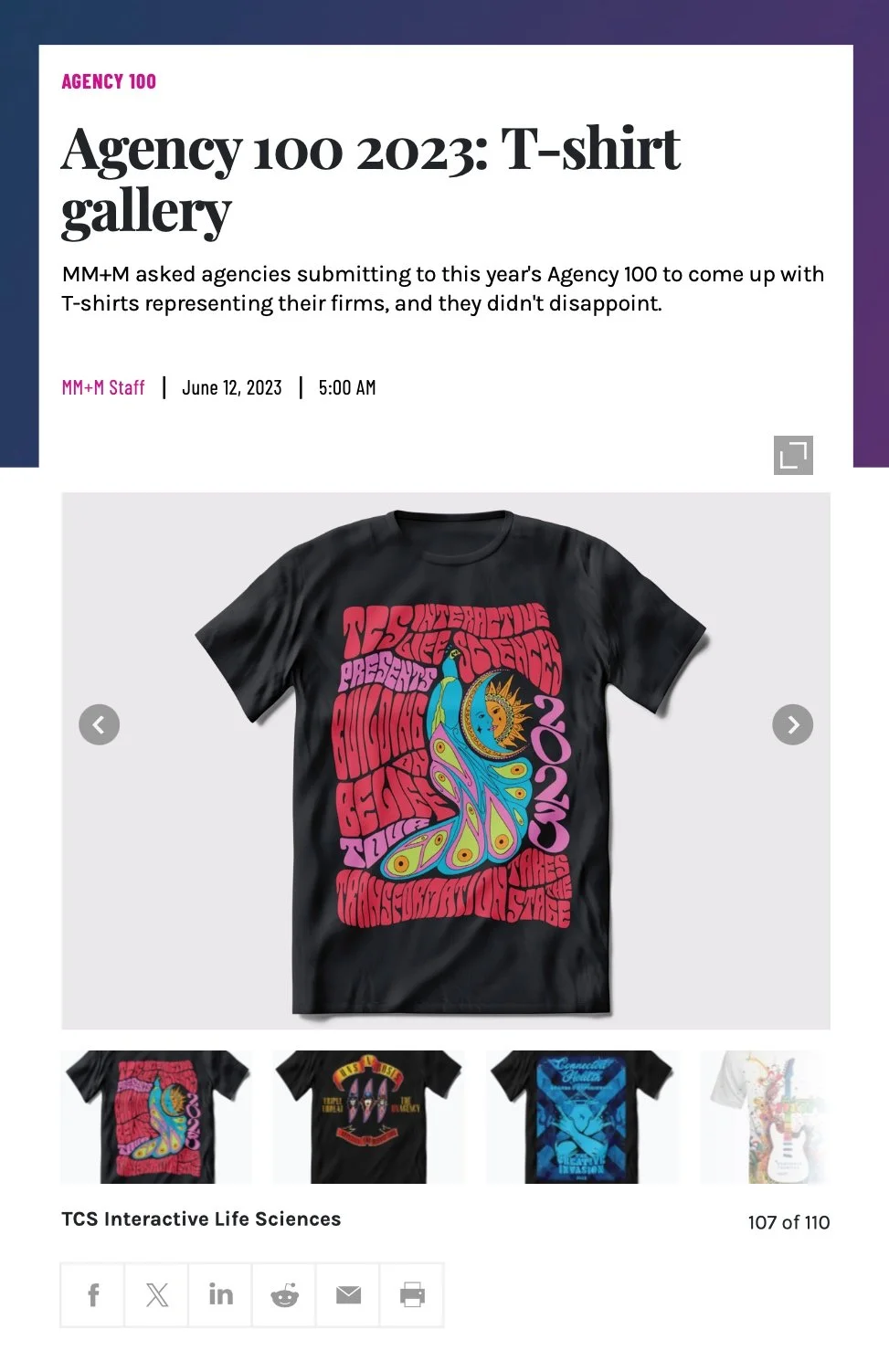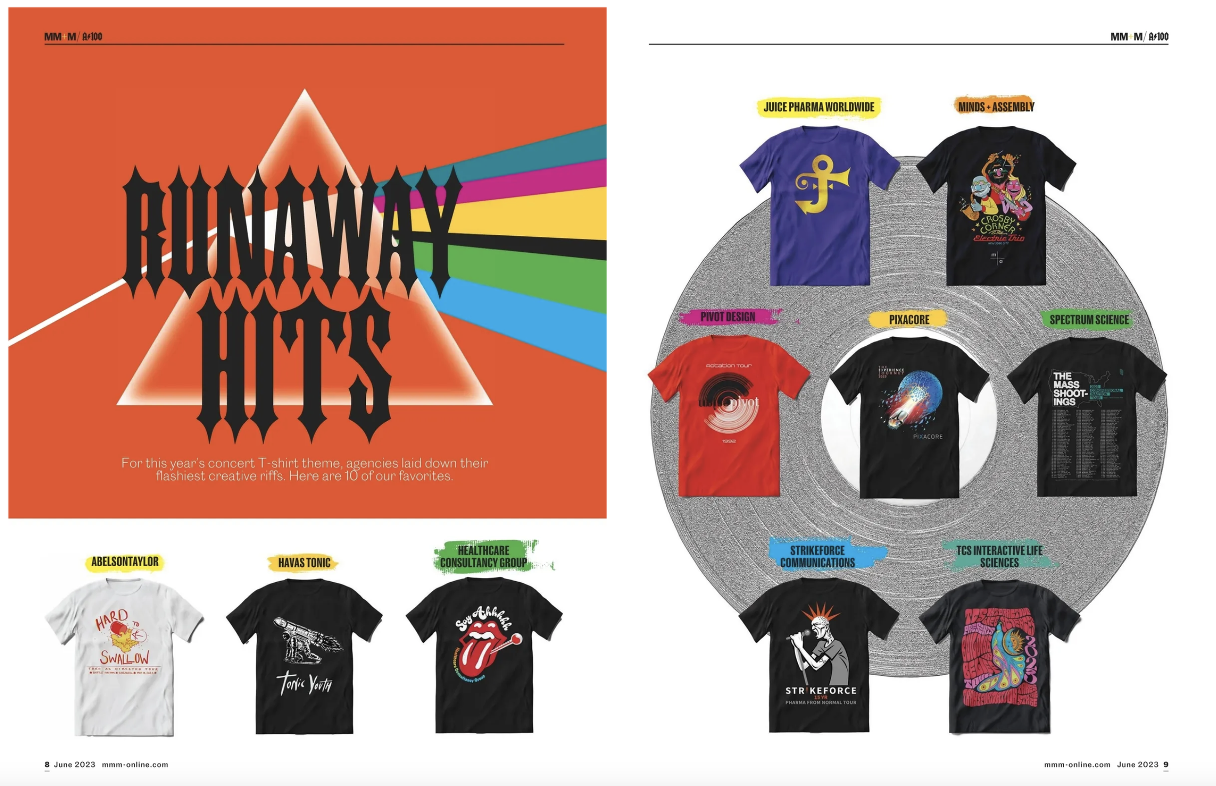 For the past few years, TCS has been selected to be featured in MM+M’s (Medical Marketing and Media) Agency 100 issue. Each year, agencies create a design to represent their company. In 2023, the prompt was to create a concert tee shirt.